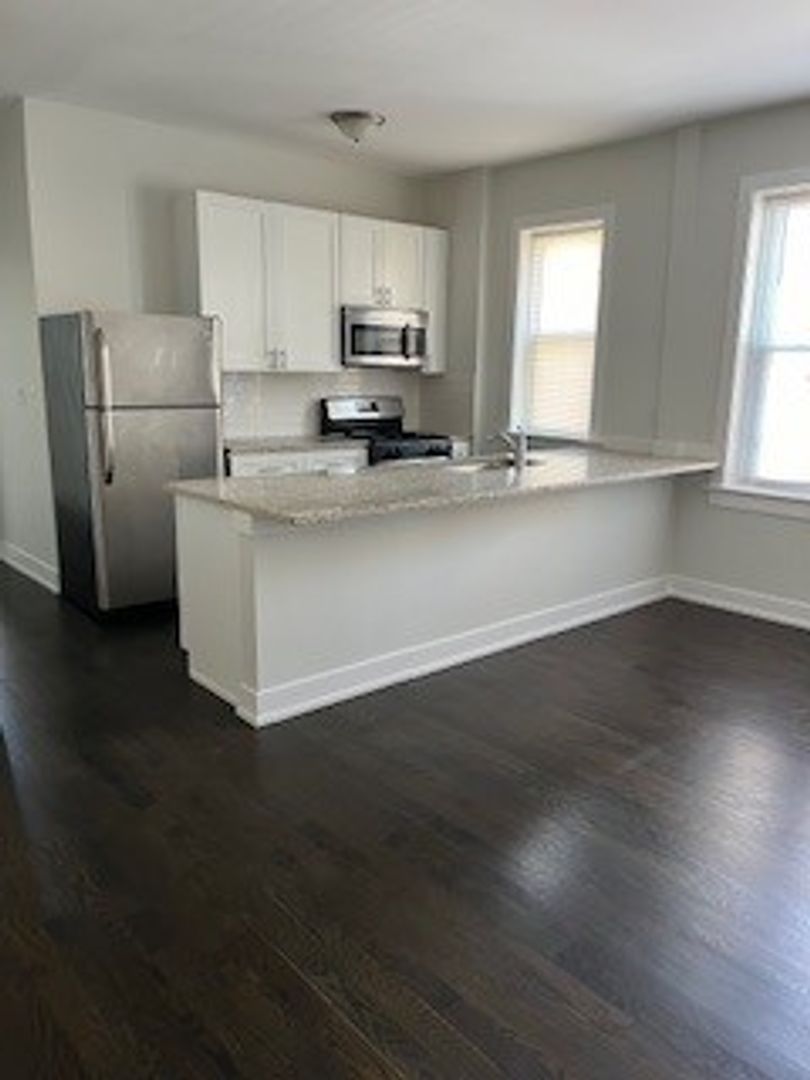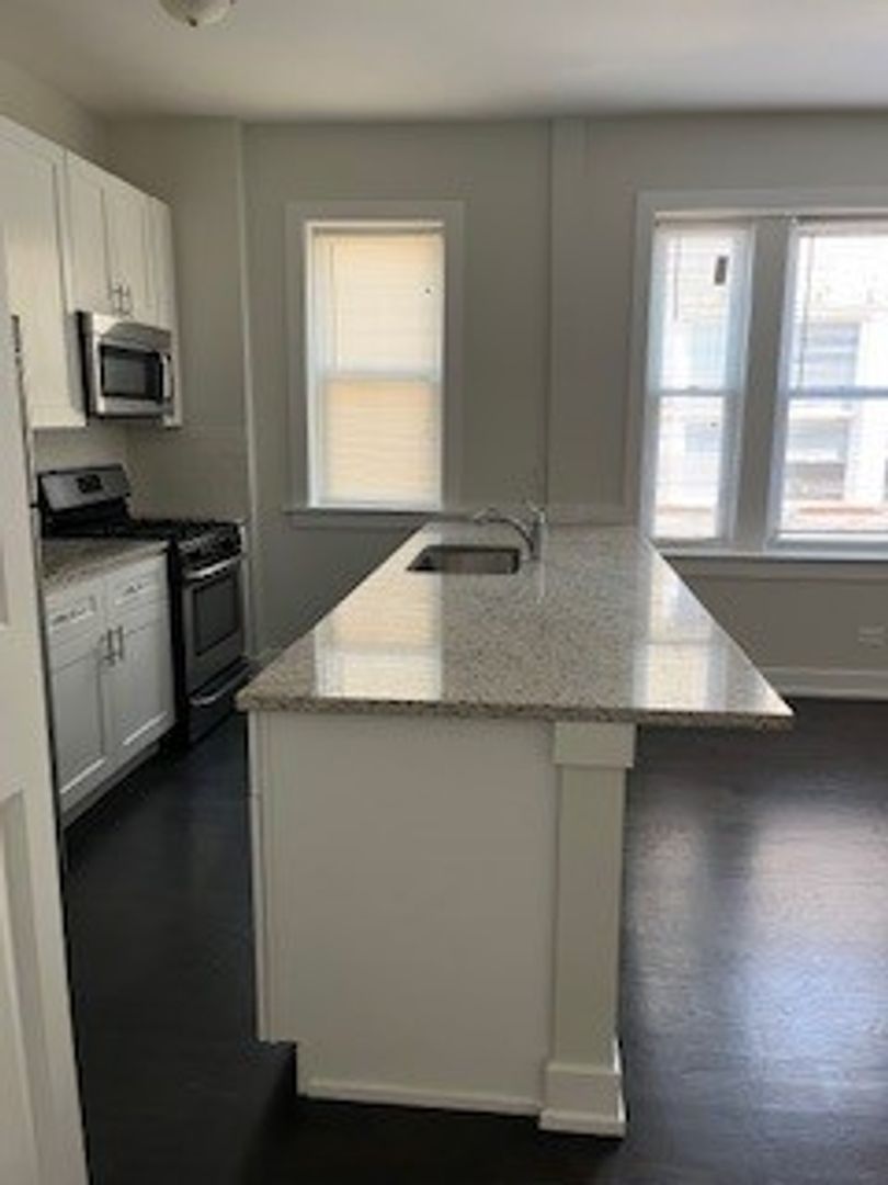 - Renovated kitchen with stone countertop and stainless steep appliances